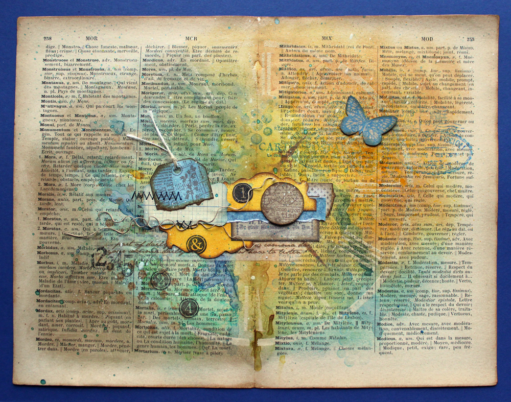RépondreSupprimerOMG Lys, I cant stop looking at this. I think it is my favourite of yours ever. So many gorgeous layers and detailing and the colour palette is the right balance of calm and excitement. I loved the resisted clock and how it contrasts with the gentle watercolouring on the background and then how all of that is offset with texturing that you have created and assembled with the stamped, ripped and stitched bits of paper and cord. Loved all of it. -Hugs- Candice