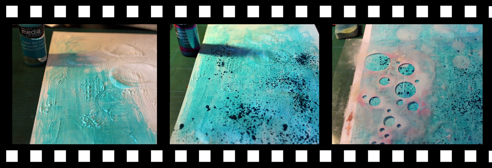 J'ai ensuite passé de l'acrylique DecoArt "teinte sarcelle cobalt", vaporisé du Turquoise et rehaussé les bulles au pochoir avec une encre blanche.
